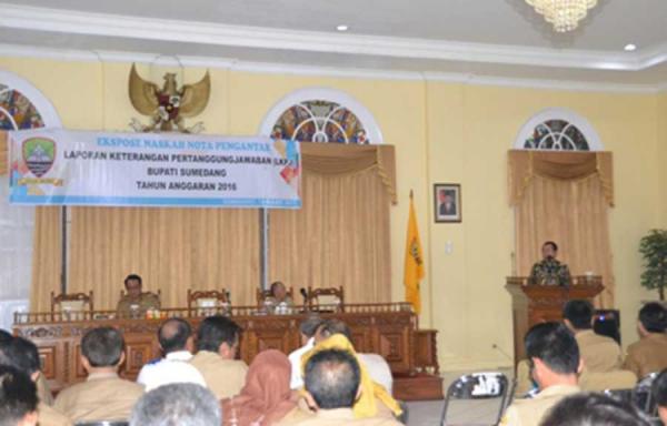 SUMEDANG-Draft Nota Pengantar Laporan Keterangan Pertanggungjawaban (LKPJ) Bupati Sumedang Tahun Anggaran 2016 disampaikan melalui Expose yang diselenggarakan di Aula Gedung Negara, Selasa, (14/3). Acara tersebut dihadiri oleh Bupati Sumedang, H. Eka Setiawan, Sekda Kabupaten Sumedang, Drs.H. Zaenal Alimin,MM, Para asisten, Para Staf Ahli, Para kepala SKPD, Para kabag, serta Para camat.