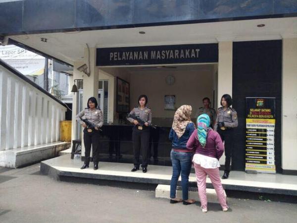 Kota Bekasi, SpiritNews-Tidak seperti biasanya. Anggota Polisi Wanita (Polwan) Polres Metro Bekasi Kota disiagakan di pos pintu masuk Mapolres Metro Bekasi Kota dilengkapi dengan senjata.