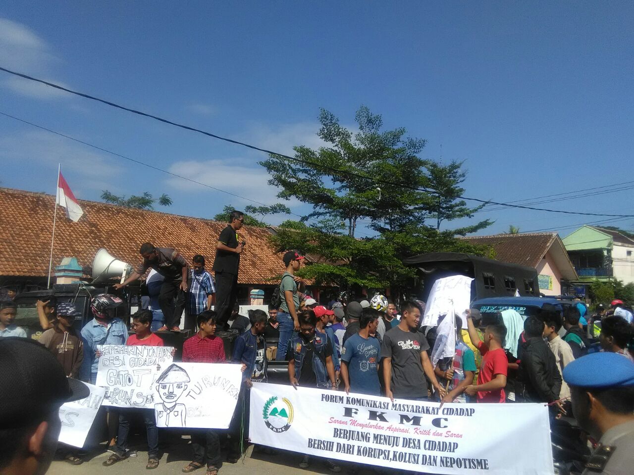 Massa mulai berkumpul sejak pukul 09.00 WIB di halaman kantor desa, dengan membawa bendera dan spanduk bertuliskan Forum Komunikasi Masyarakat Desa Cidadap. Massa kemudian secara bergiliran melakukan orasi.