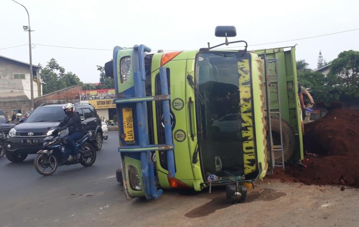 Kabupaten Bandung, SpiritNews-Truk bermuatan tanah merah terguling di Jalan Raya Cileunyi tepatnya sebelum Pintu Gerbang Tol (GT) Cileunyi, Kabupaten Bandung, Jawa Barat. Insiden kecelakaan ini tidak menimbulkan korban jiwa.