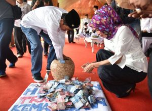 Para pejabat yang hadir tampak memasukan uang pecahan Rp 50 ribu dan Rp 100 ribu ke dalam gentong kecil yang telah disediakan.