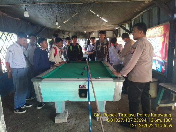 Kabupaten Karawang, spiritnews.co.id – Dua anggota Polsek Tirtajaya, Polres Karawang, Aipda Adang Suhaya,S.H, dan Bripka Guruh Erwanto melaksanakan patroli dan membubarkan sejumlah siswa SMAN 1 Tirtajaya yang sedang main bilyard, Senin (12/12/2022).