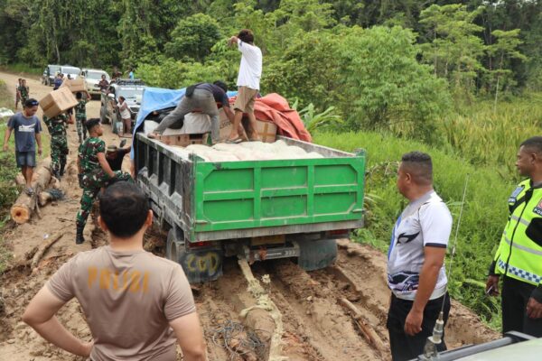 Dokumentasi dari lapangan memperlihatkan kondisi jalan yang berlumpur, licin, dan berlubang, membentang di tengah hutan belantara wilayah Moskona, Papua Barat. Jalur tanah yang sempit, diapit oleh tebing curam serta rimbunnya vegetasi liar, membuat kendaraan tim kerap tersendat. Tak jarang, kendaraan harus dibantu alat berat untuk bisa melanjutkan perjalanan. Genangan air dan lumpur pekat menjadi pemandangan sehari-hari yang menguji ketangguhan fisik, mental, dan semangat personel di lapangan.